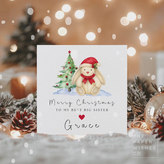 Send warm festive wishes with this charming personalised Christmas card featuring an adorable bunny in a Santa hat, sitting beside a beautifully decorated tree. Designed in a soft toy style, this sweet and cosy illustration brings a touch of magic to any child or loved one’s Christmas. Whether it's for a sibling, friend, or family member, this heartwarming design is perfect for sharing holiday joy.