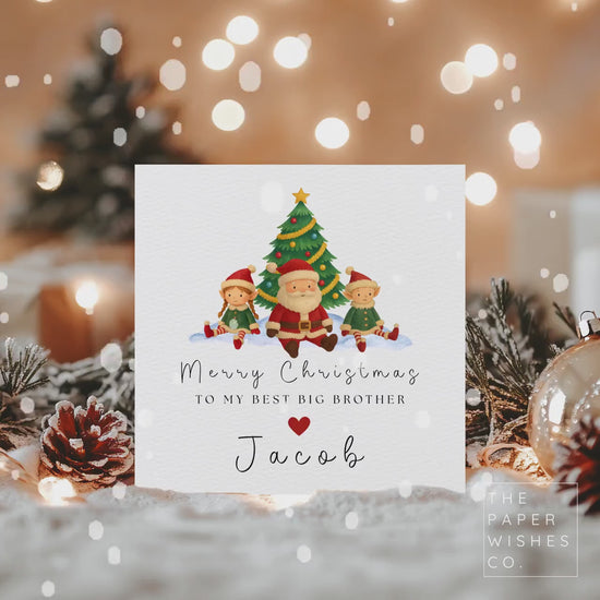 Celebrate the magic of Christmas with this adorable personalised card featuring Santa and his two cheerful elves sitting beside a glowing tree. With soft toy-style charm and a warm festive palette, this card is perfect for children, siblings, cousins, or anyone who loves the joy of the season. Add any name or relation to make it a truly personal keepsake for someone special this Christmas.