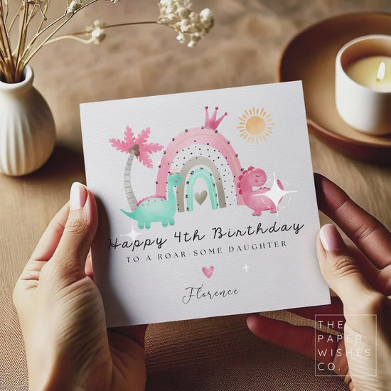 Personalised Dinosaur Birthday Card – Pink Dino & Rainbow Design – Custom Name and Age – Cute Roarsome Kids Card