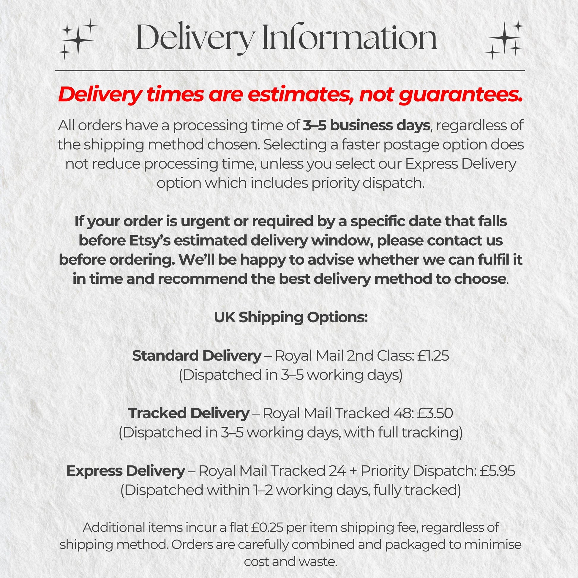 Our standard postage is Royal Mail 2nd Class. The delivery date provided by Etsy is an estimate and not a guaranteed delivery date. Please take this into account when ordering and select the shipping option that best suits your timeframe.