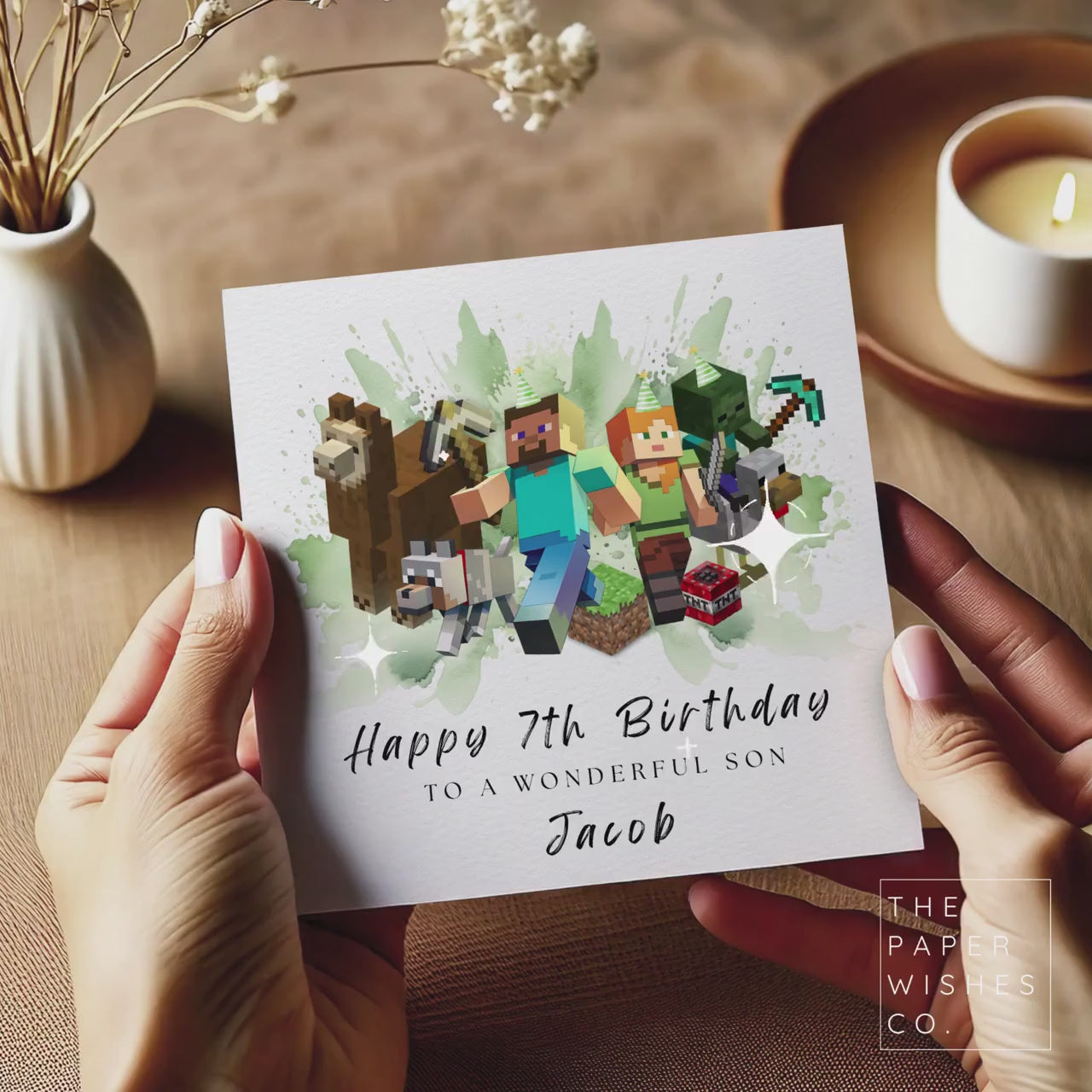 Level up their birthday with this epic Minecraft-inspired birthday card! Featuring fan-favourite blocky characters, animals, and gear, this vibrant design is perfect for any little gamer. Personalise it with any name, age, and recipient – ideal for boys, girls, or siblings who love Minecraft!