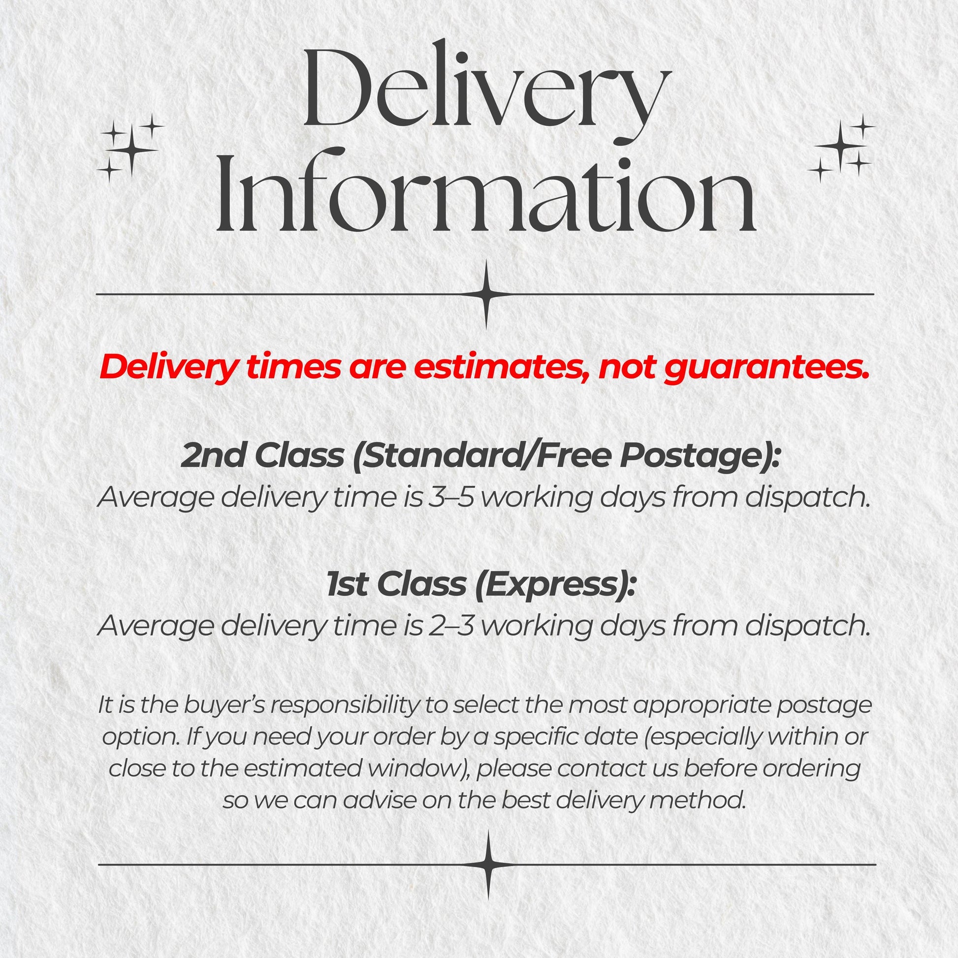 Our standard postage is 2nd class mail. The delivery date given by Etsy is an estimate and not a guarantee. Please take this into account when ordering and select the most appropriate postage for your order.